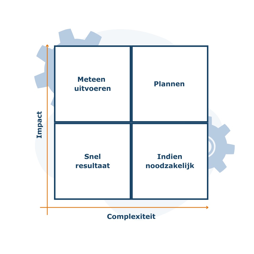 Een selectie van verbeteringen die direct na het traject opgepakt kunnen worden. Laagdrempelig, snel resultaat en zichtbaar voor de organisatie.